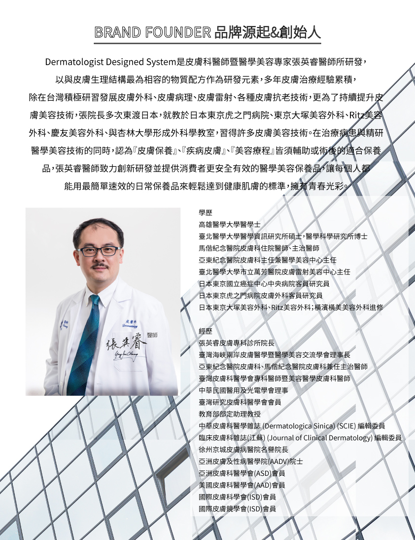 The Dr. Deung's Skin Clinic (New Taipei Institute of Dermatology) was established by dermatologist Dr. Ying-Jui Chang in July of 2012. Based upon the medical center standardized infrastructure, we provide the special services for skin diseases, aesthetic medicine and dermatologic surgery. Uphold the purposes of “Quality, Safetyand Efficiency”, we adhere the spirit of excellence and connect to the international trends;our professional team design the most suitable treatment course for individual skin conditions.Under the long-term clinical experiences, Dr. Chang realized the skincare products play important roles in taking care of the skin, helping treating skin diseases, as well as providing post-procedural recovery.