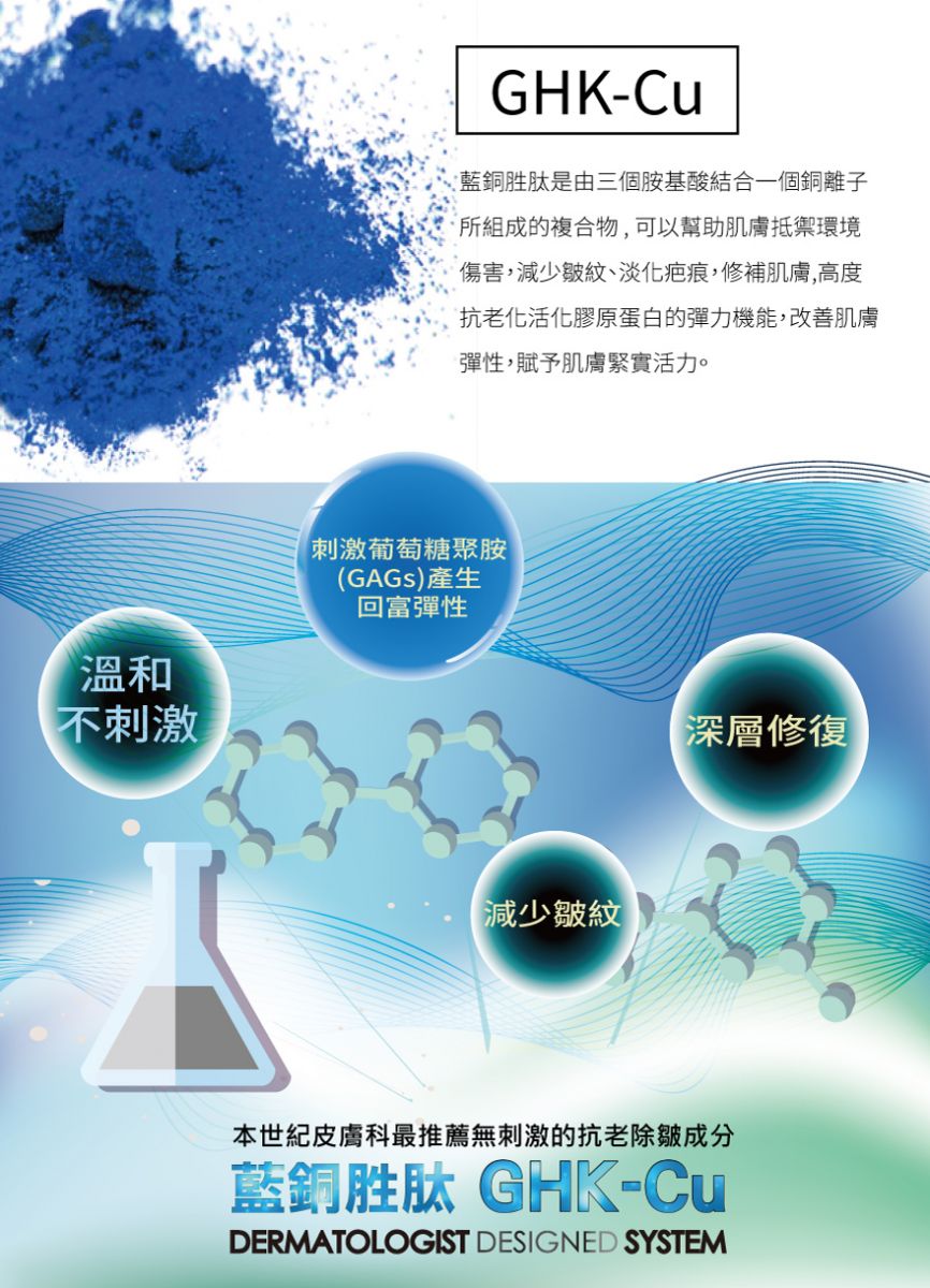 全球皮膚科醫師多熟知的藍銅胜肽,對改善肌膚傷口,修復肌膚老化痕跡,效果確實相當不錯,且藍銅胜肽與一般含銅保養品相比,相當穩定,不會與空氣輕易作用氧化,因此更能確保其深入肌膚的滲透率,而當藍銅胜肽進入肌膚後,更可促進膠原蛋白與彈力蛋白新生,由內而外修護老化皺紋、鬆弛問題,且藍銅胜肽也沒有A酸、左旋C、果酸等積極抗老成分的刺激性。
