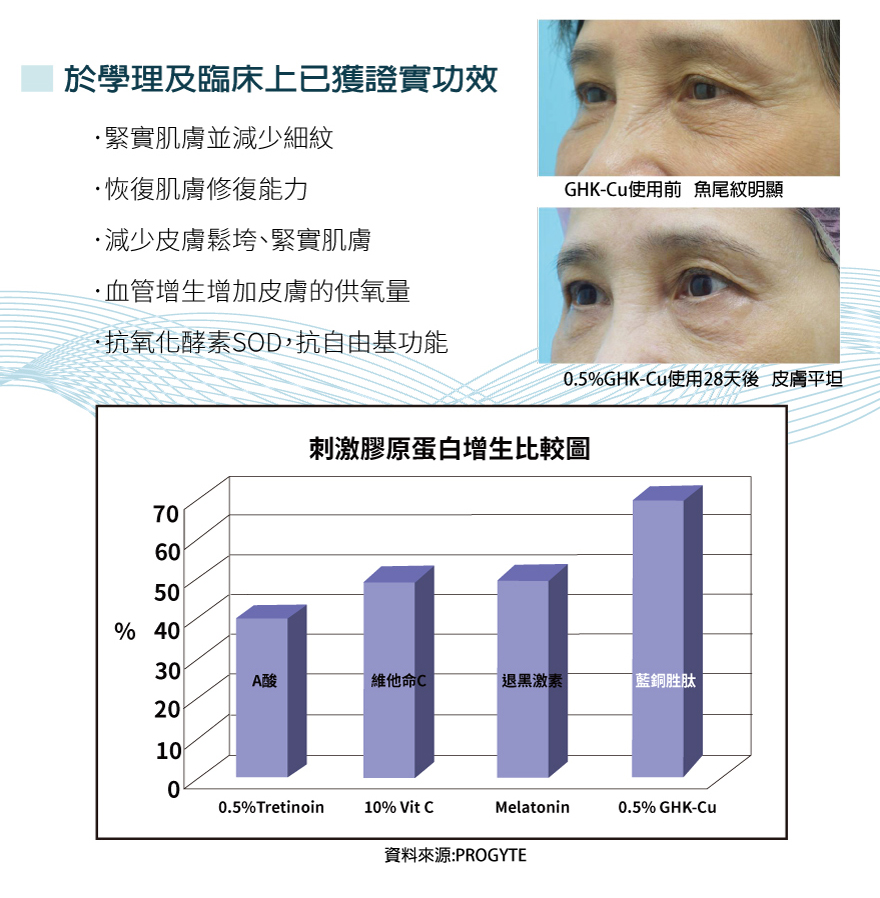 藍銅胜肽 GHK-Cu 具有促進纖維母細胞合成膠原蛋白的作用We report the stimulating effect of GHK-Cu on collagen synthesis by fibroblasts.(出處: Stimulation of collagen synthesis in fibroblast cultures by the tripeptide-copper complex glycyl-L-histidyl-L-lysine-Cu2+.FEBS Lett. 1988 Oct 10;238(2):343-6.)